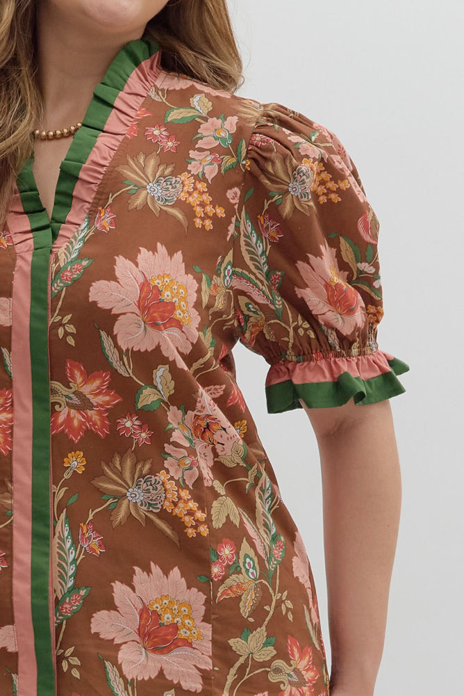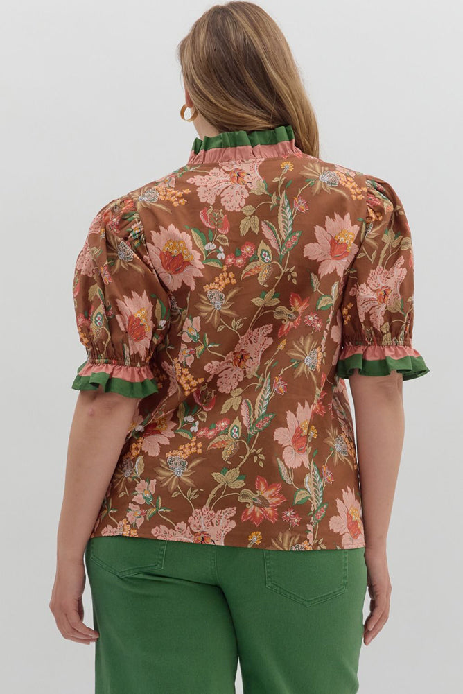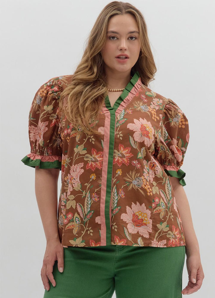 Plus Floral Print Shoulder Puff Top in Brown by Entro