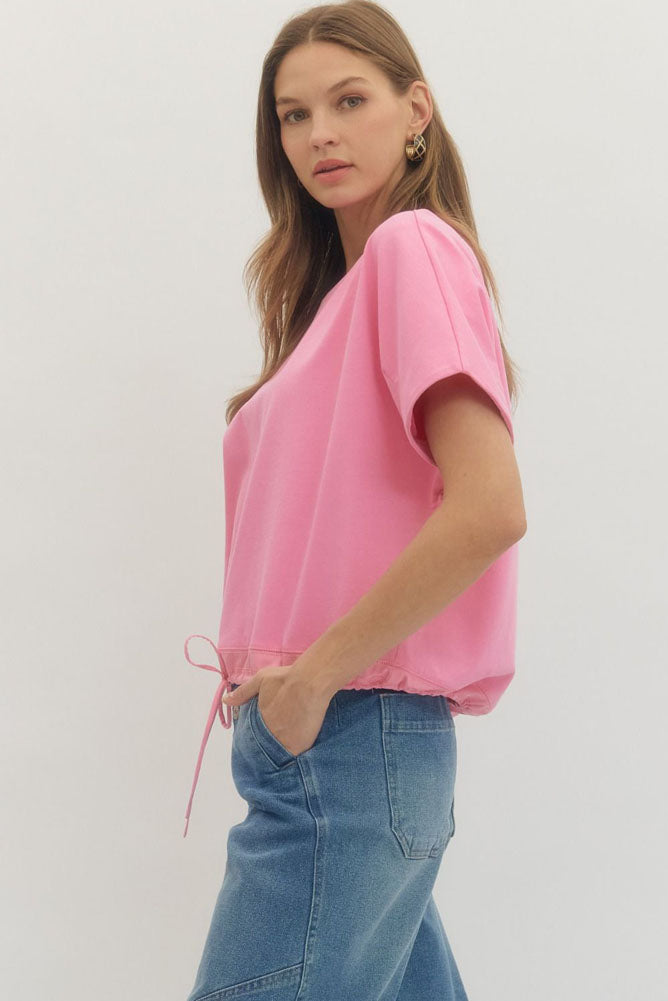 Solid SS Drawstring Hem Top in Pink by Entro