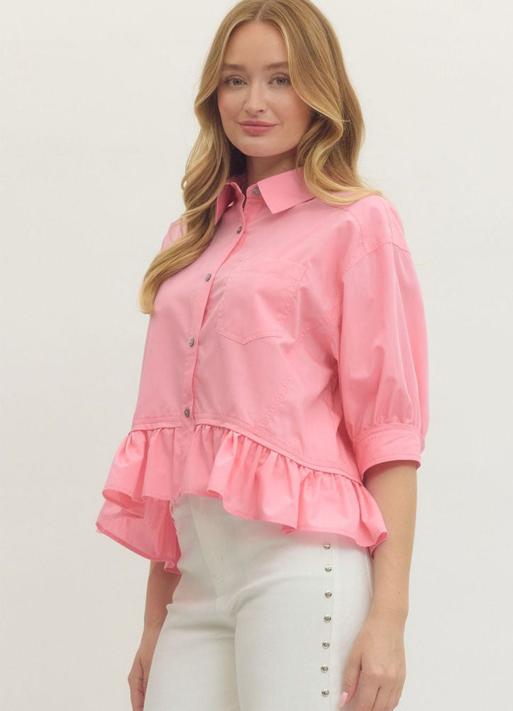 Solid 3/4 Sleeve Button Down Ruffle Hem Top in Pink by Entro