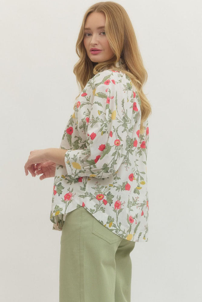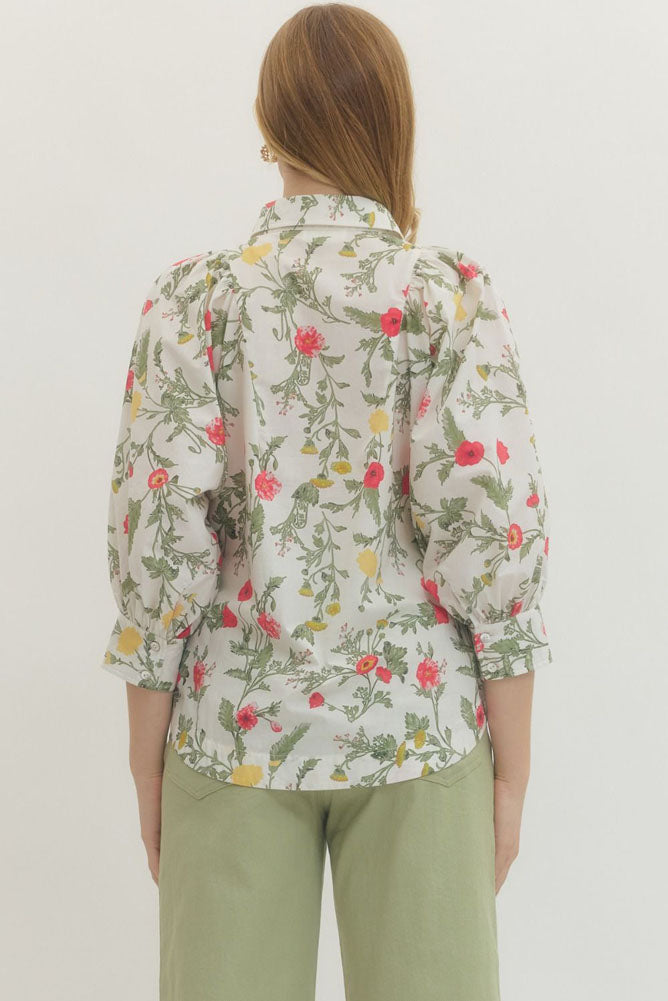 Floral Print 3/4 Puff Sleeve Button Front Top in Cream by Entro