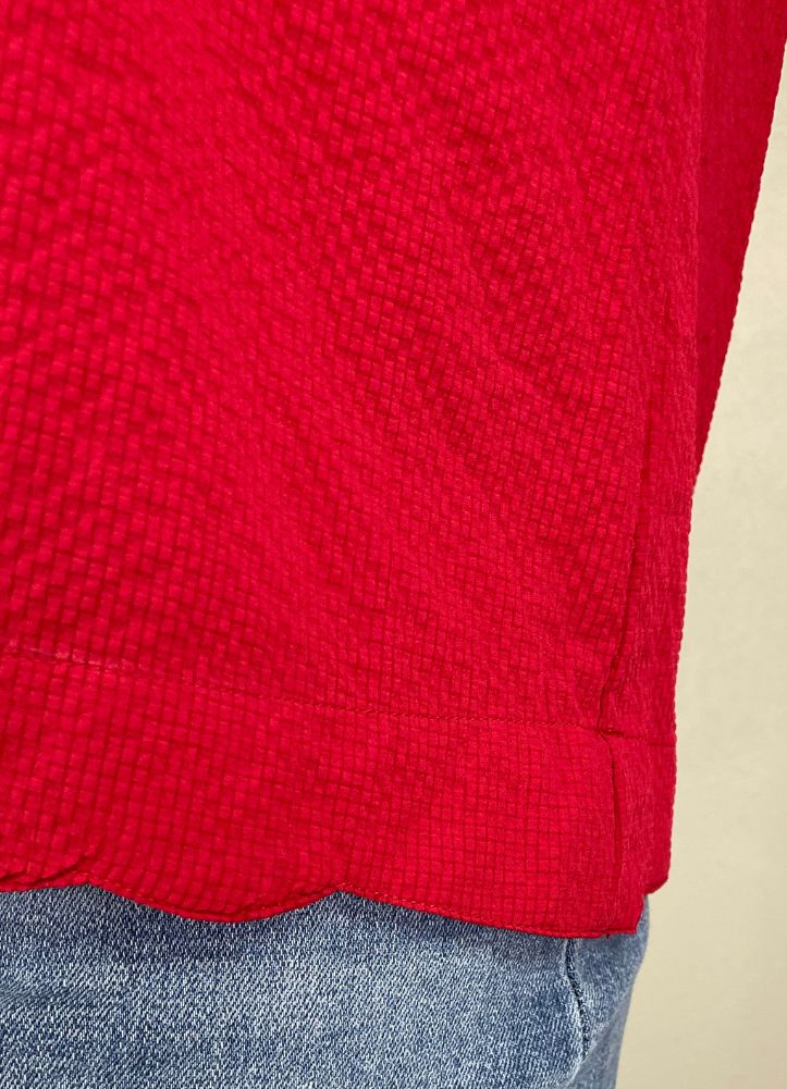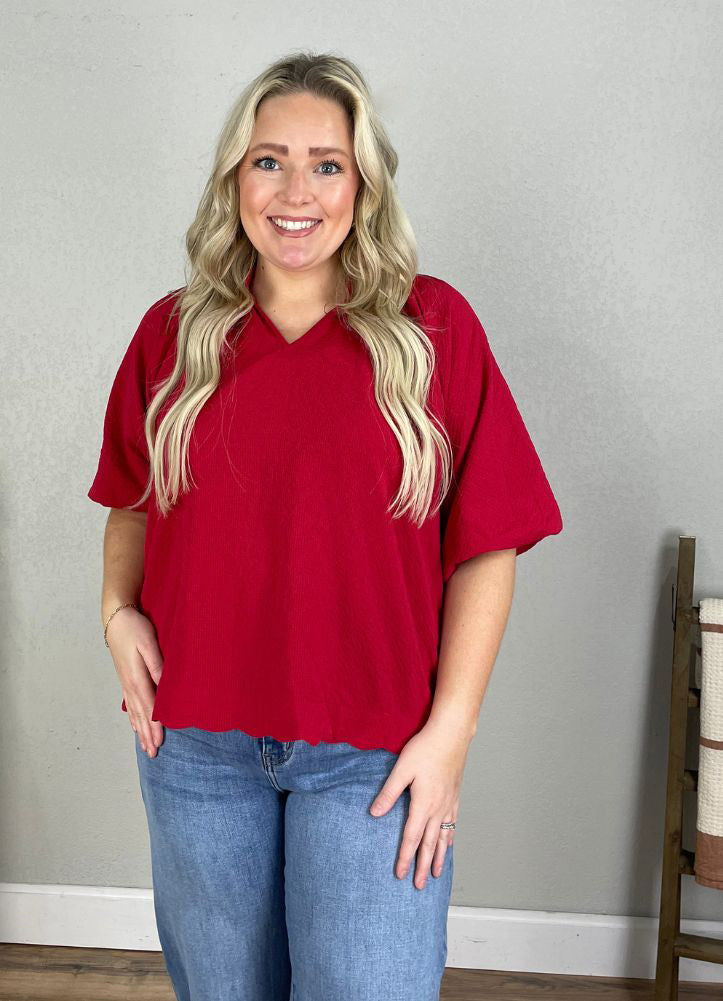 Brighten up your basics with this bold red V-neck top, crafted from soft textured knit fabric for everyday comfort. The relaxed fit and slightly scalloped hem add a touch of easygoing charm.