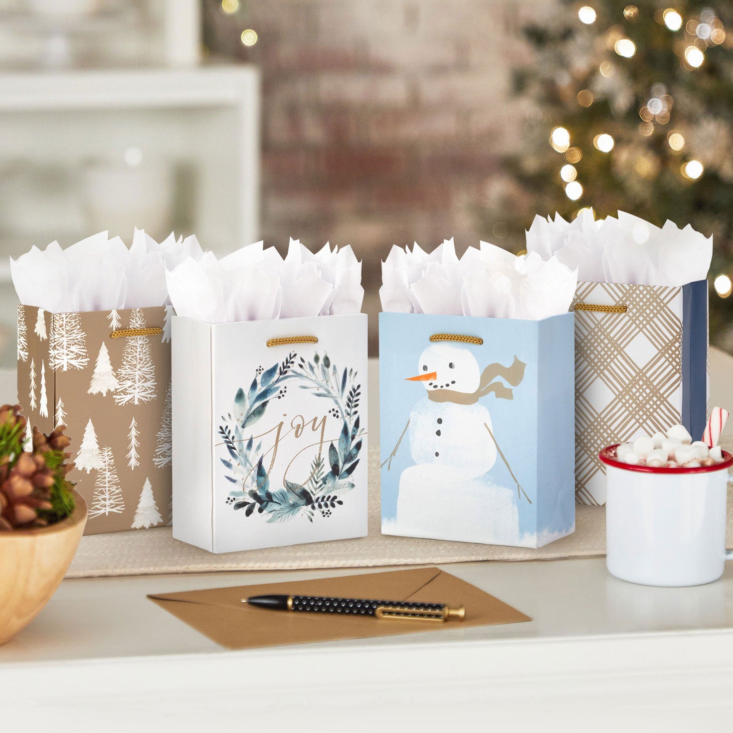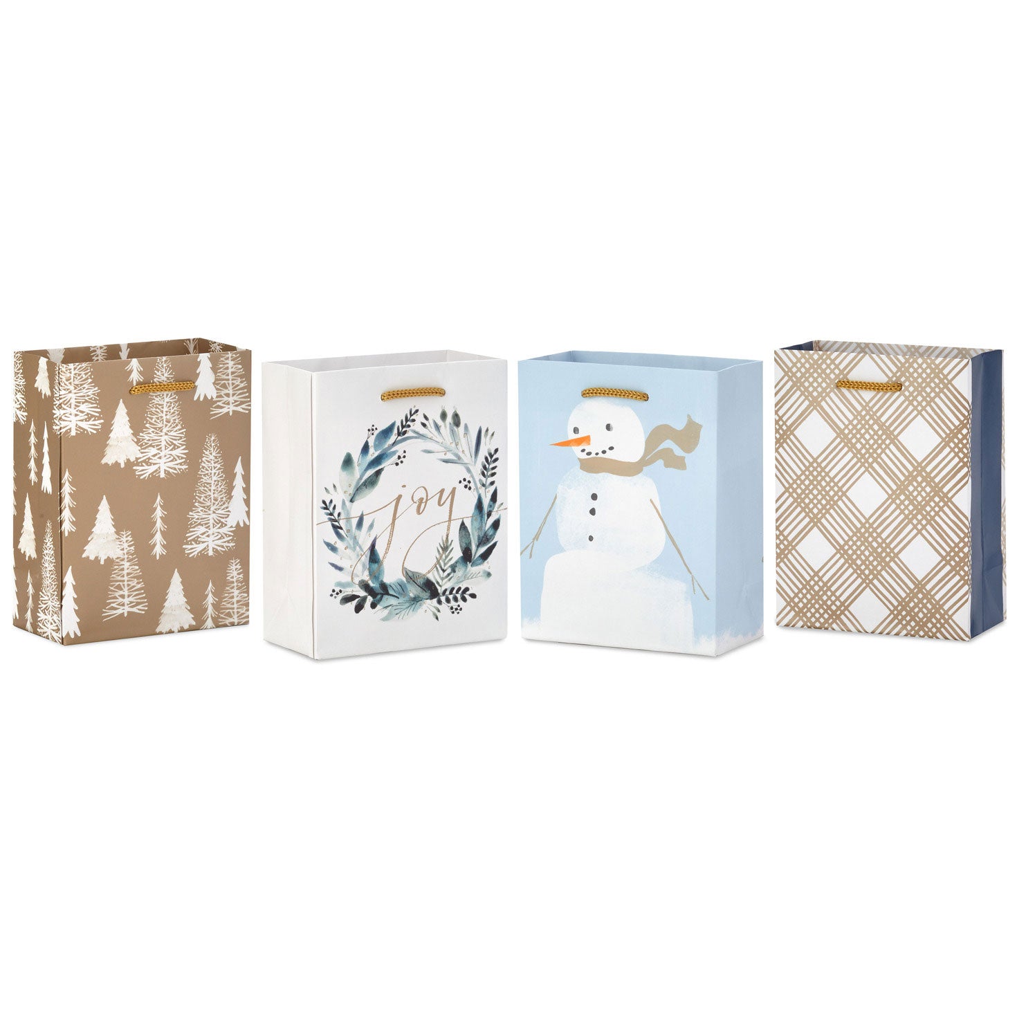 * Pack includes 4 small holiday gift bags in coordinating designs with metallic ink accents: snowman on gray, pewter plaid, joy wreath on white and evergreens on pewter
