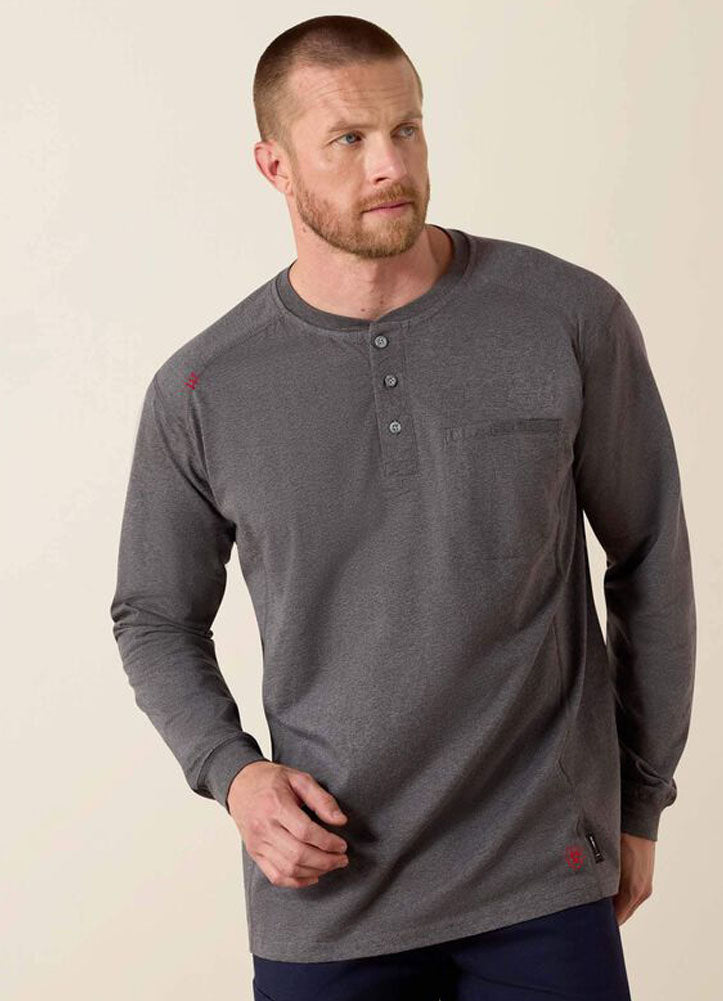 Combine comfort, durability, and easy everyday style with this Ariat long-sleeve Henley. Crafted from soft, breathable fabric, it features a three-button placket, reinforced stitching, and a subtle chest pocket for added functionality. The relaxed fit allows for comfortable movement whether you're on the job, relaxing at home, or layering it under a jacket on cooler days. Finished in a versatile charcoal gray with understated Ariat branding, this Henley delivers a rugged yet refined look that fits seamlessly into any hardworking wardrobe.