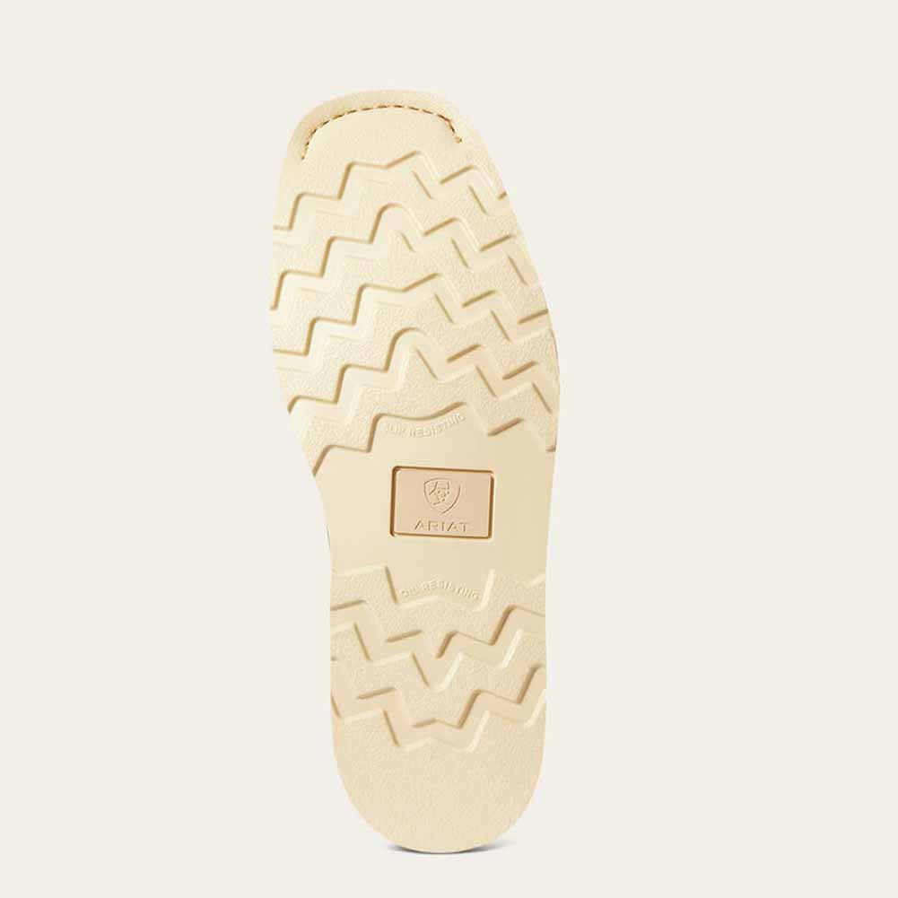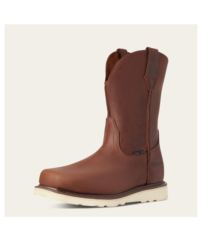 Start a hard day of work in these comfortable Rambler work boots by Ariat. Detailed in a foothill brown with accents of black on the logo. Features white wedged waterproof soles for all of your outside adventures. Lace free for an easy slip on.