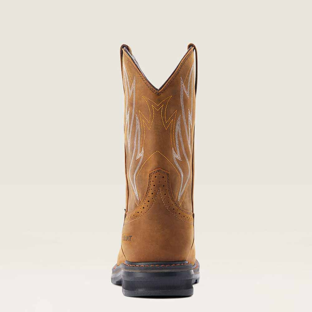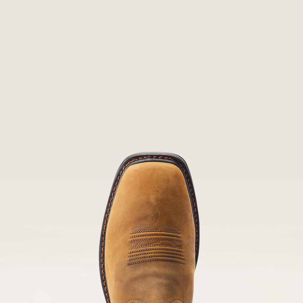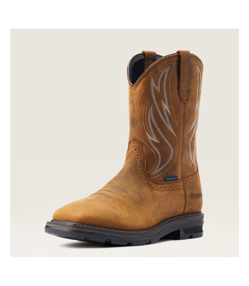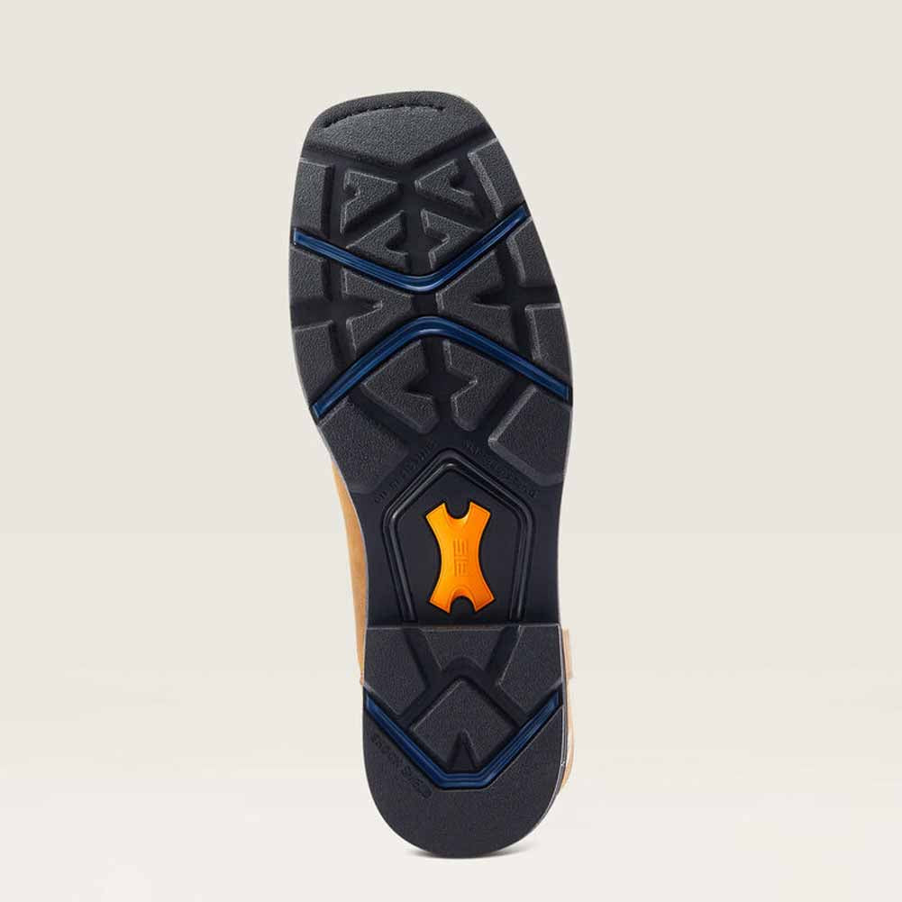 Start a hard day of work in these comfortable Sierra shock shield boots by Ariat. Detailed in a light brown with gold and white designs on the side. Features rubber waterproof soles for all of your outside adventures. Lace free for an easy slip on.