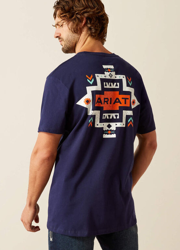 Bold heritage vibes — this classic blue graphic tee features a Southwestern-inspired back print with vibrant tribal motifs and a standout ARIAT logo, delivering casual comfort with Western attitude.