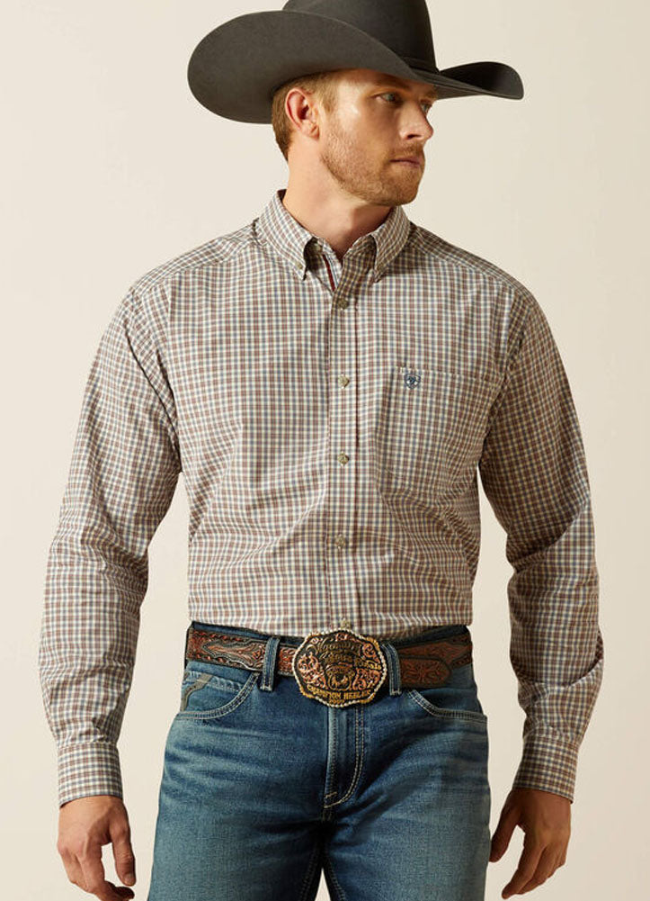 This brown plaid western shirt is built for lasting comfort and style, featuring a button-down collar, chest logo detail, and durable fabric that transitions seamlessly from ranch work to casual nights out.