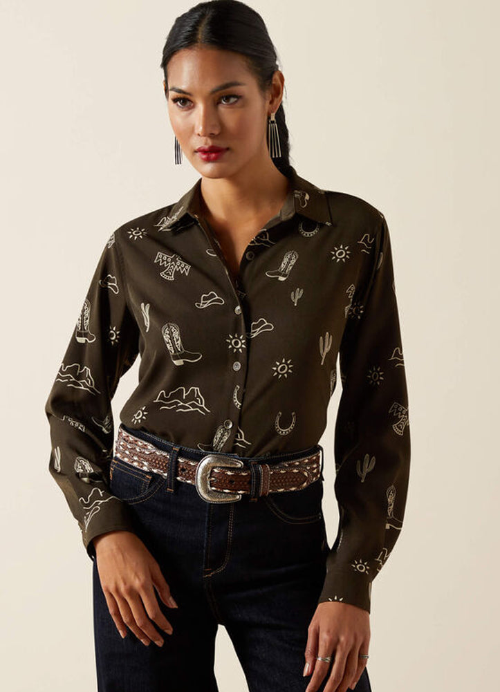 This Ariat women's long sleeve shirt in olive green features playful western graphics, a button-front design, and a flattering fit for casual or ranch inspired style.