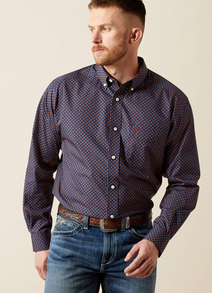This long-sleeve button-down shirt features a refined navy base accented with a subtle repeating geometric pattern, creating a stylish balance of modern detail and classic design. Its tailored fit, crisp collar, and versatile color make it an ideal choice for both everyday wear and polished occasions.