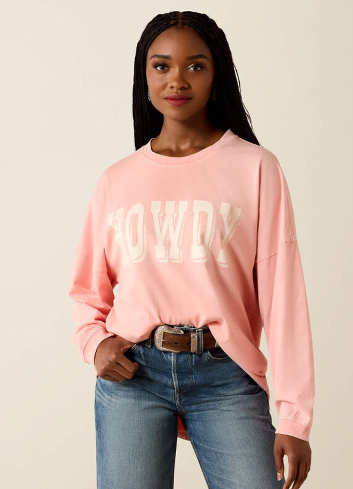 Soft, relaxed, and full of western attitude, this women's long-sleeve sweatshirt features a muted blush-pink wash with a subtle, vintage-inspired “HOWDY” graphic across the chest. Designed with a roomy, laid-back fit, it offers dropped shoulders, ribbed cuffs, and a classic crew neckline for all-day comfort. The lightweight fleece fabric feels smooth and cozy without being bulky, making it perfect for layering or wearing on its own. Effortlessly casual, this sweatshirt pairs easily with denim, boots, or sneakers for an easygoing, everyday western look.