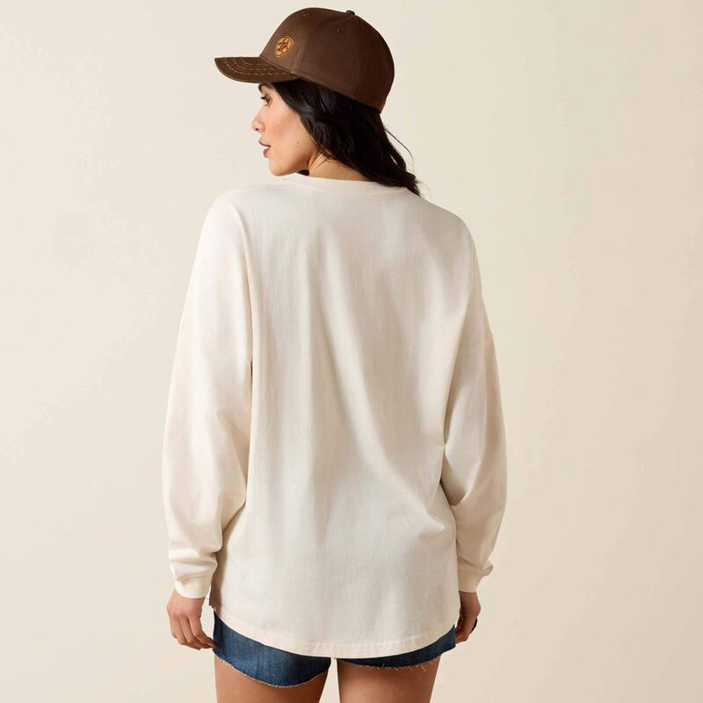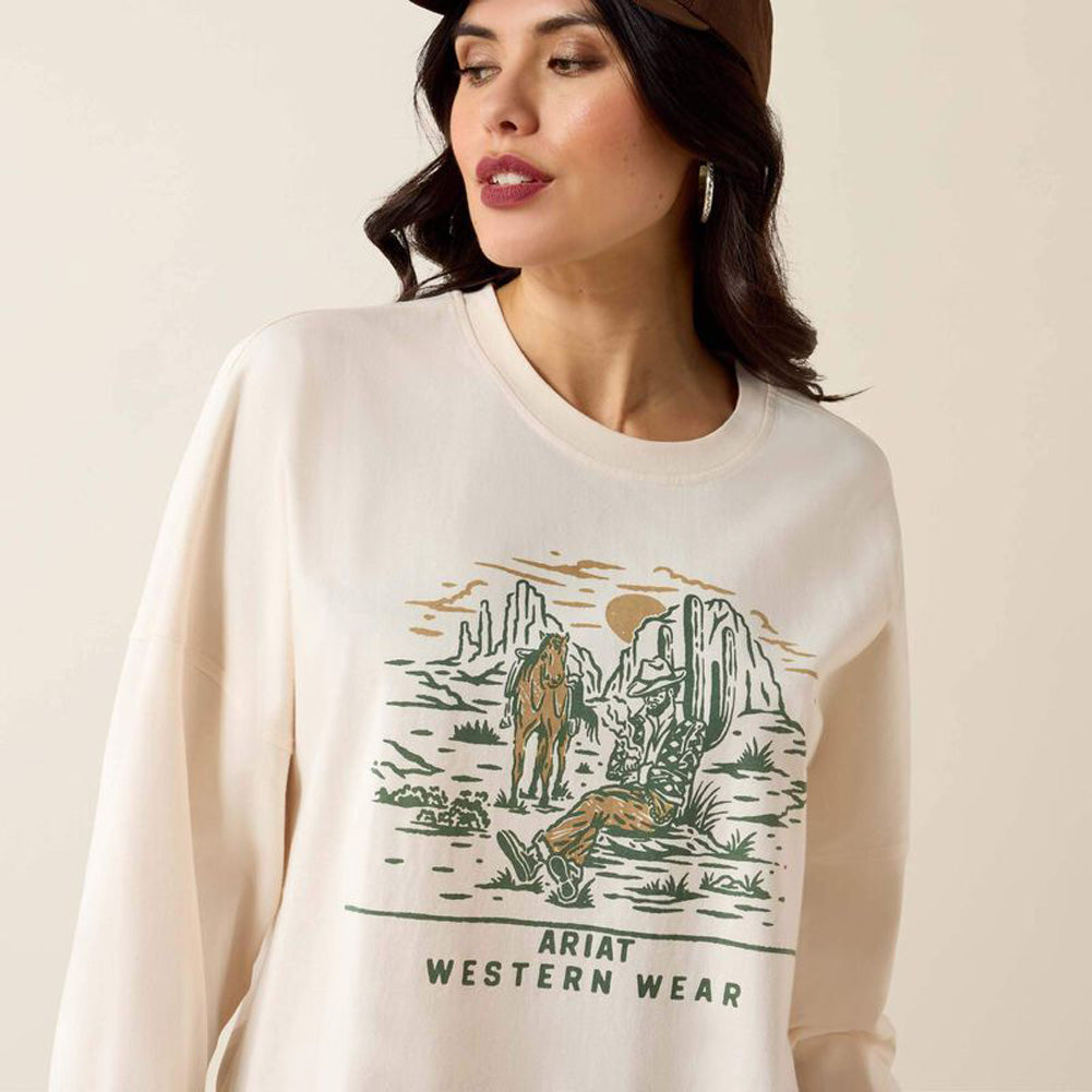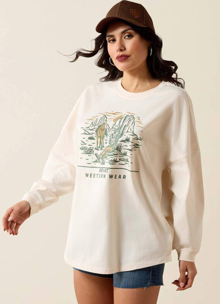 Relaxed and effortlessly stylish, this oversized long-sleeve graphic tee delivers laid-back comfort with a western-inspired edge. Crafted from a soft, breathable cotton blend, it features a roomy silhouette with dropped shoulders for an easy, lived-in feel. The front graphic showcases a scenic western illustration paired with subtle Ariat branding, adding character without overpowering the look. Finished with ribbed cuffs and a classic crew neckline, this versatile top pairs perfectly with denim shorts, jeans, or leggings for casual days, cool evenings, or weekend adventures.
