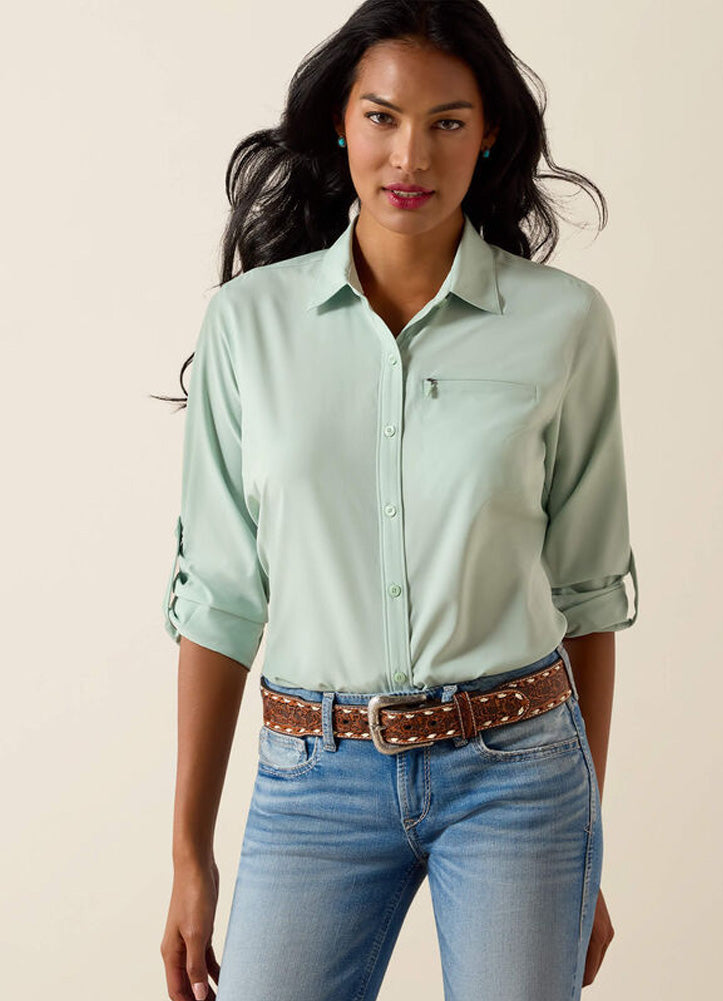 Soft, refined, and endlessly versatile, this long-sleeve button-down is crafted in a smooth, lightweight fabric that drapes beautifully while offering all-day comfort. The clean solid color delivers a fresh, modern take on classic western style, accented by a sleek chest pocket and a tailored feminine silhouette. Roll-tab sleeves allow for easy styling from workdays to weekends, making it a go-to piece that pairs effortlessly with denim, boots, or casual layers for a confident, put-together look.