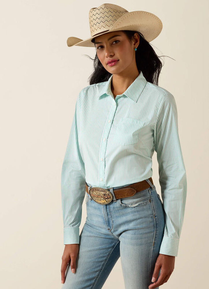 Fresh, classic, and effortlessly flattering, this long-sleeve button-down features a crisp vertical stripe pattern that brings timeless western style to any outfit. Designed with a tailored feminine fit, structured collar, and clean chest pocket, it delivers a polished look with all-day comfort. The lightweight fabric and adjustable cuffs make it perfect for layering or wearing solo, pairing beautifully with denim and boots for everything from long days on the ranch to casual evenings out.