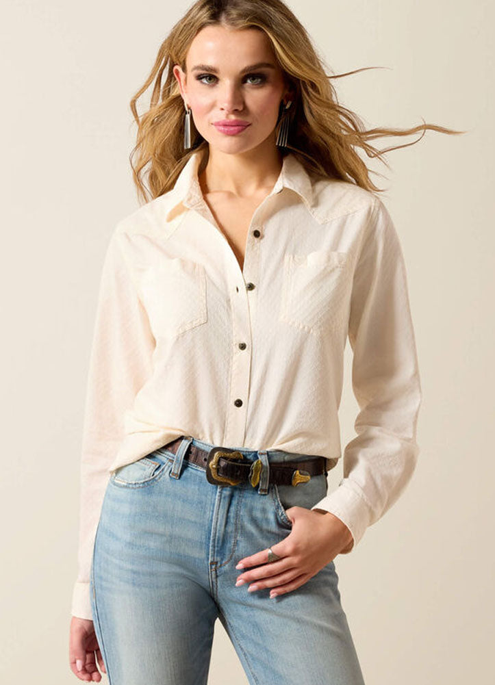 Soft, feminine, and effortlessly refined, this button-up brings a fresh take to classic Western-inspired style. Crafted from lightweight, breathable fabric, it drapes beautifully while offering comfortable all-day wear. The subtle texture and delicate stitching add dimension and interest, elevating the look without overpowering its clean, timeless design. A tailored silhouette flatters the figure while maintaining a relaxed feel, making it easy to wear tucked into denim or styled loose for a more casual vibe. The soft neutral tone pairs seamlessly with jeans, belts, and boots, creating endless outfit possibilities for work or weekend wear. Finished with a traditional collar and button-front closure, this shirt balances heritage-inspired details with modern polish. Long sleeves add versatility across seasons, whether layered or worn on their own. Perfect for dressing up or down, this piece transitions effortlessly from daytime outings to evenings out. Elegant yet easygoing, it's a wardrobe staple designed to stand the test of time and style.