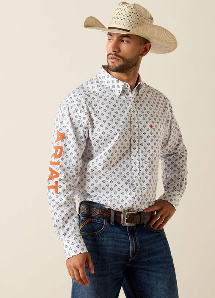 Western style with a modern edge. This long-sleeve button-down features a crisp geometric print, classic collar, and a comfortable, easy-wear fit. Finished with bold Ariat branding along the sleeve and subtle logo details, it's built for long days, special occasions, and everything in between. Whether you're in the saddle or heading out for the night.