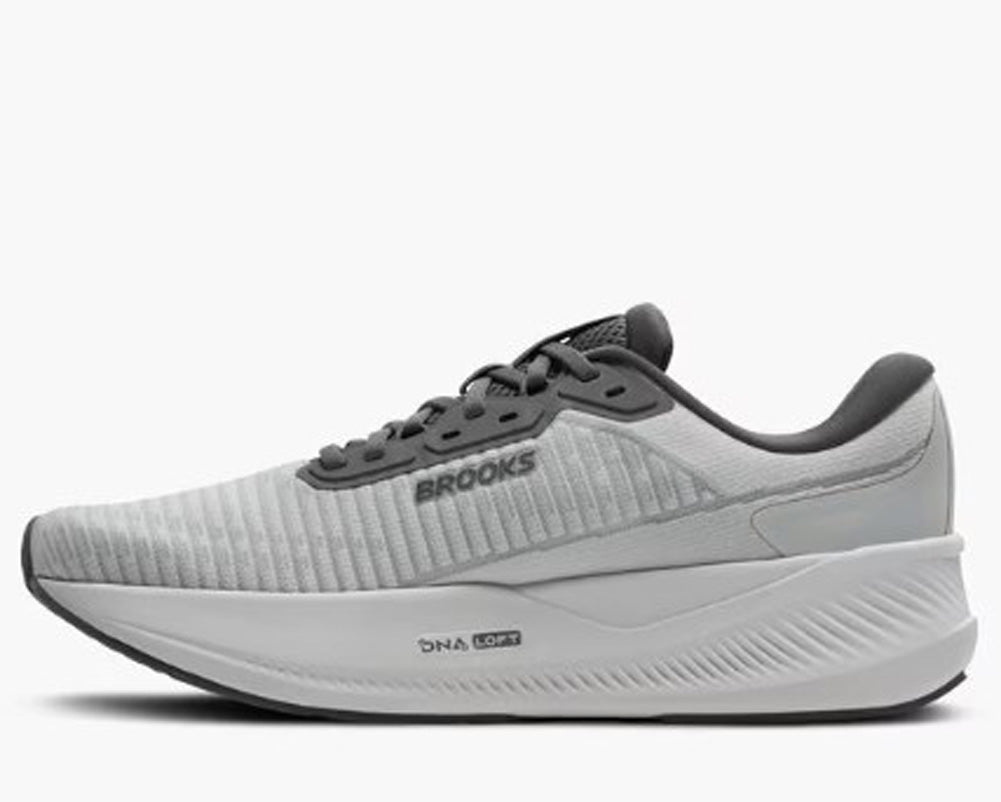 This neutral gray performance running shoe blends lightweight comfort with reliable support for everyday training. The breathable engineered mesh upper offers a soft, adaptive fit that moves naturally with the foot while maintaining airflow for all-day comfort. A cushioned midsole provides smooth, responsive shock absorption to help reduce impact during runs or long walks. The structured heel and supportive midfoot design promote stability without feeling restrictive, while the durable rubber outsole delivers dependable traction on pavement and treadmill surfaces. Finished with subtle contrast detailing and streamlined Brooks branding, this versatile shoe is ideal for running, walking, and casual wear.