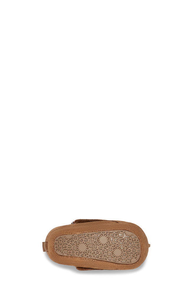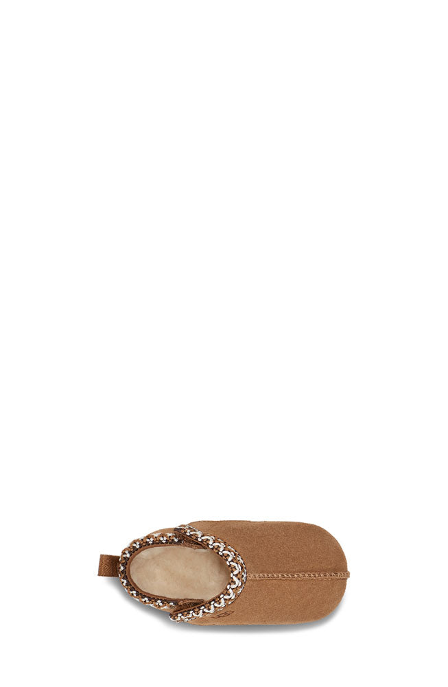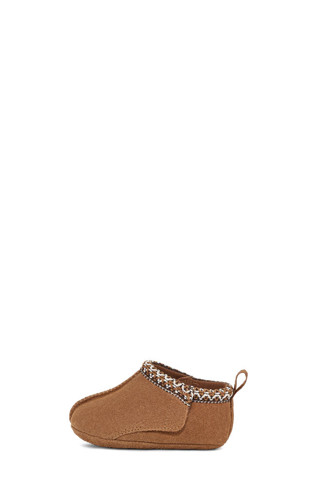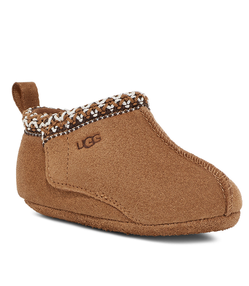 We have received this Baby Tasman slip on shoe from UGG. It comes in the color Chestnut and has a cute fluff design around the opening of the shoe! It also features a durable sole to easily travel indoors and out.