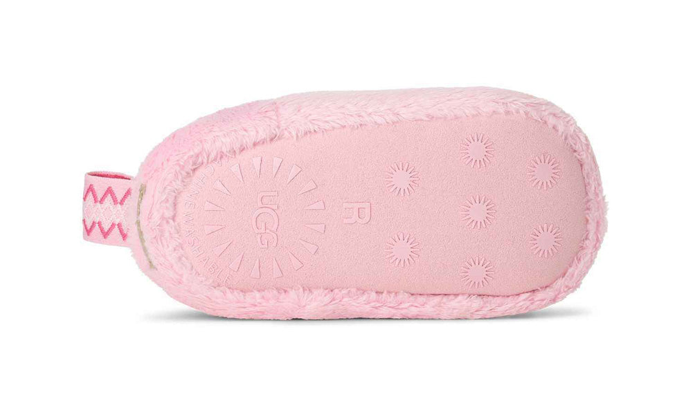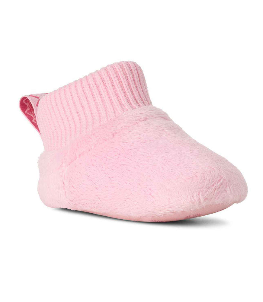 This soft and fluffy pink slipper for infant features a plush, cozy texture and a stretchy ribbed collar, gently hugging tiny feet with warmth and comfort for everyday snuggly wear.