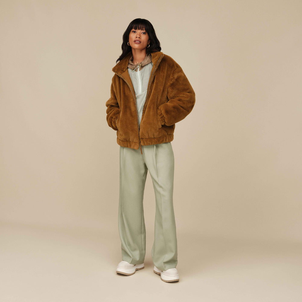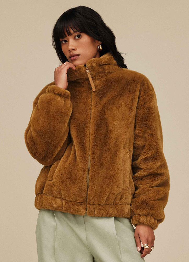 Wrap yourself in warmth and luxury with this plush brown faux fur jacket. Designed with a high collar, full zip closure, and relaxed fit, it offers cozy comfort and effortless sophistication—perfect for layering on chilly days while maintaining a chic, modern look.