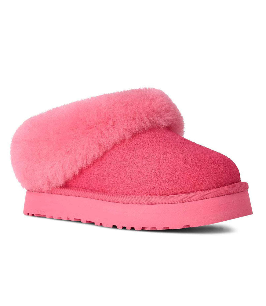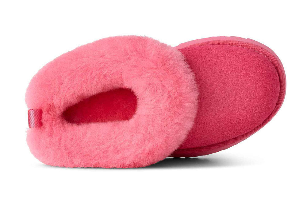 UGG brings us these Kid's Tazzelle style shoes in the color of pink bloom. Featuring a thick shearling collar that goes around the entire shoe except at the back logo area.