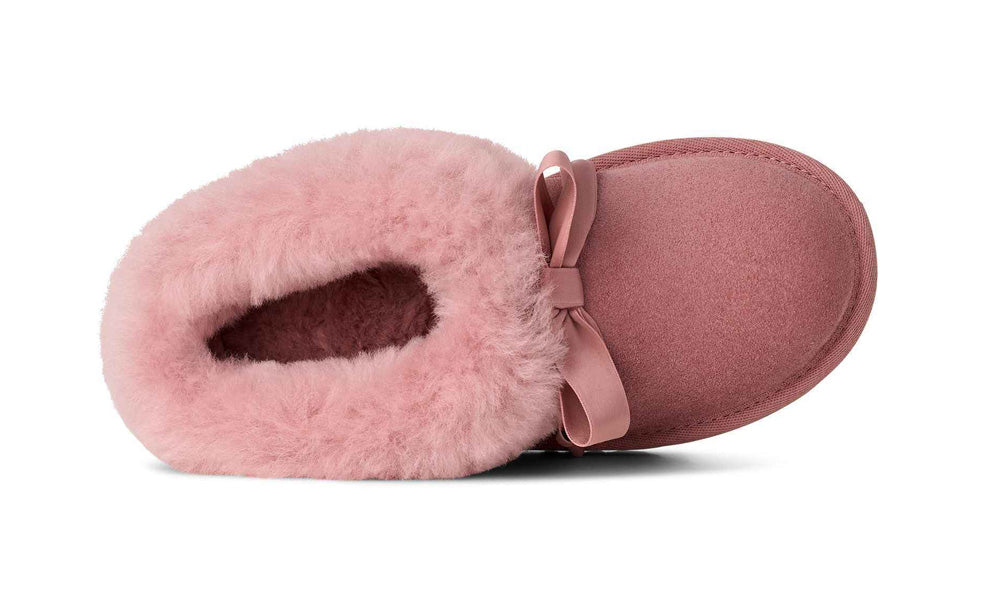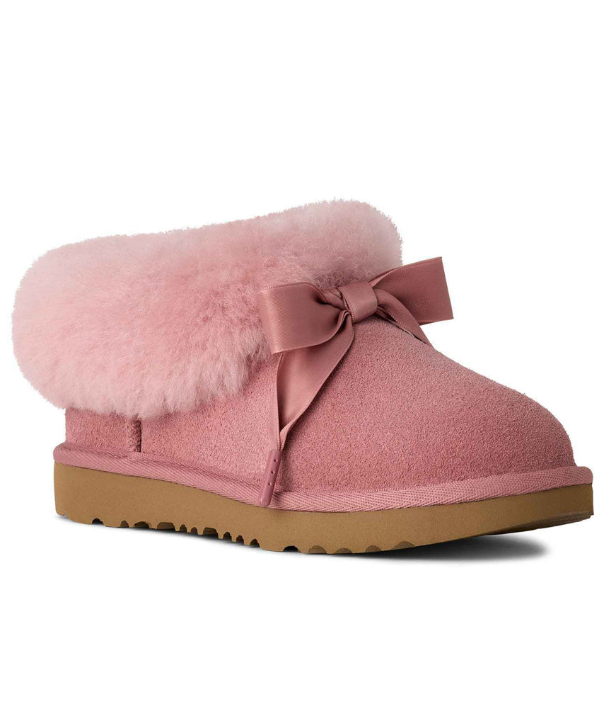 This adorable pink suede boot features a plush fluffy collar and a charming satin bow, blending sweet feminine style with cozy warmth and everyday comfort for the perfect cold-weather look