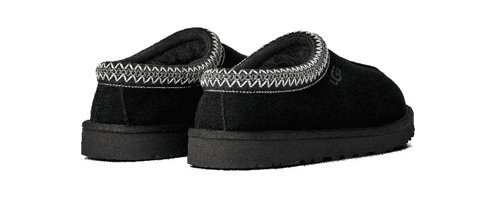 This black UGG slipper is crafted with a sleek suede upper, cozy plush lining, a bold platform sole, and detailed woven trim, delivering modern style with lasting comfort.
