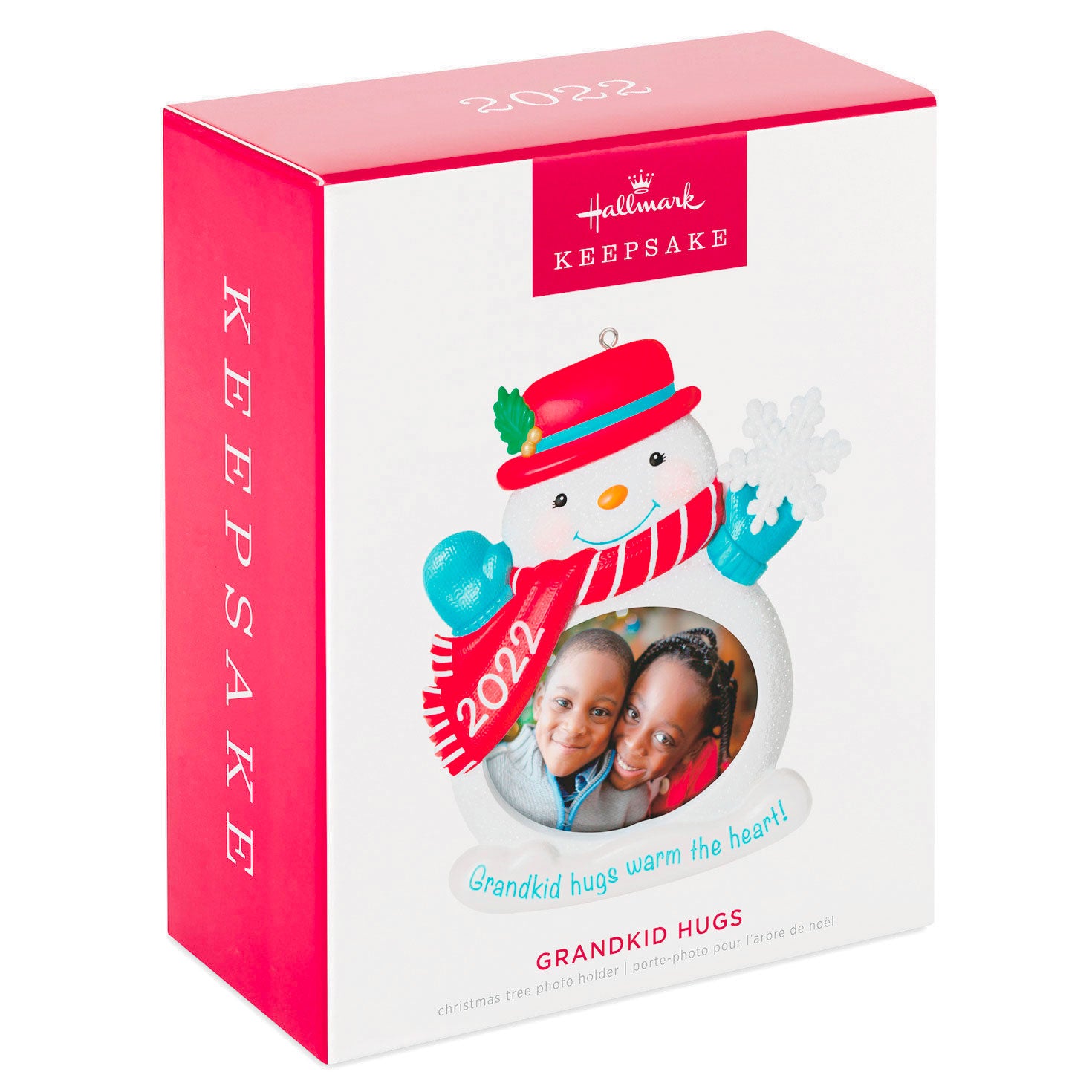 Celebrate a special relationship between grandparents and grandkids with this sweet Christmas tree ornament that features a glittery snowman picture frame design. Slip a photo into the center so grandma and grandpa can think of hugging their grandkids every time they look at this darling decoration. Year dated 2022.