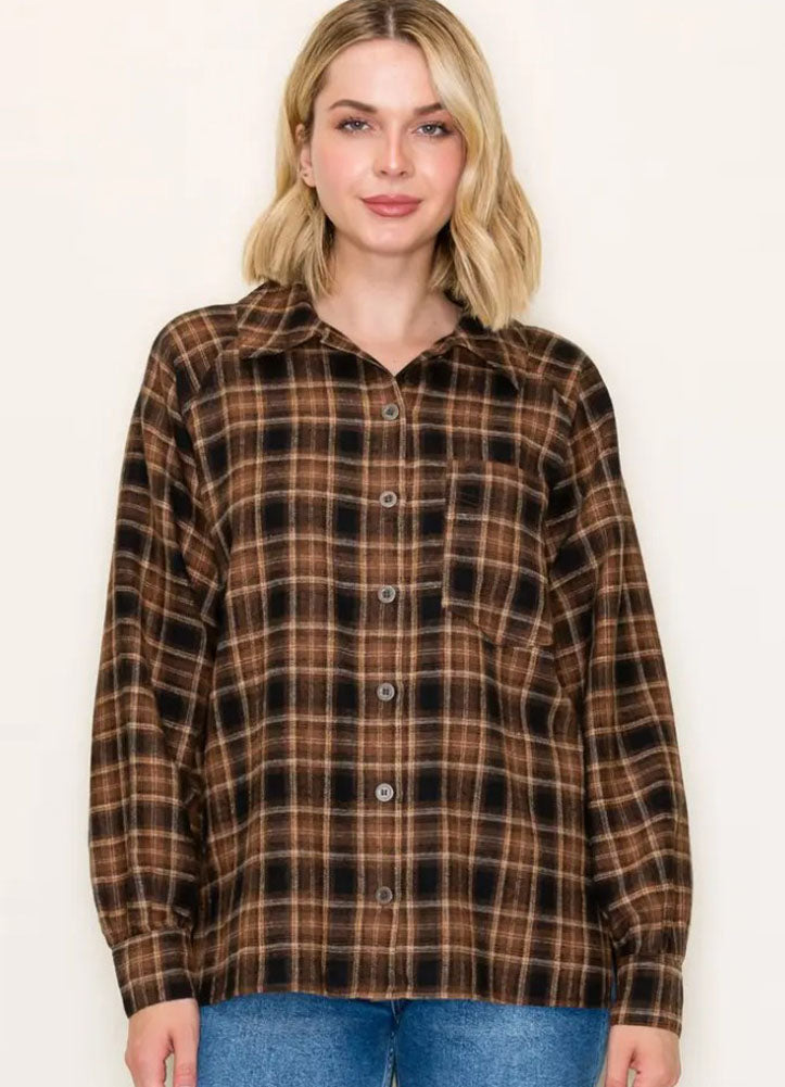 Raglan Sleeve Plaid Button Down Shirt in Taupe by Staccato