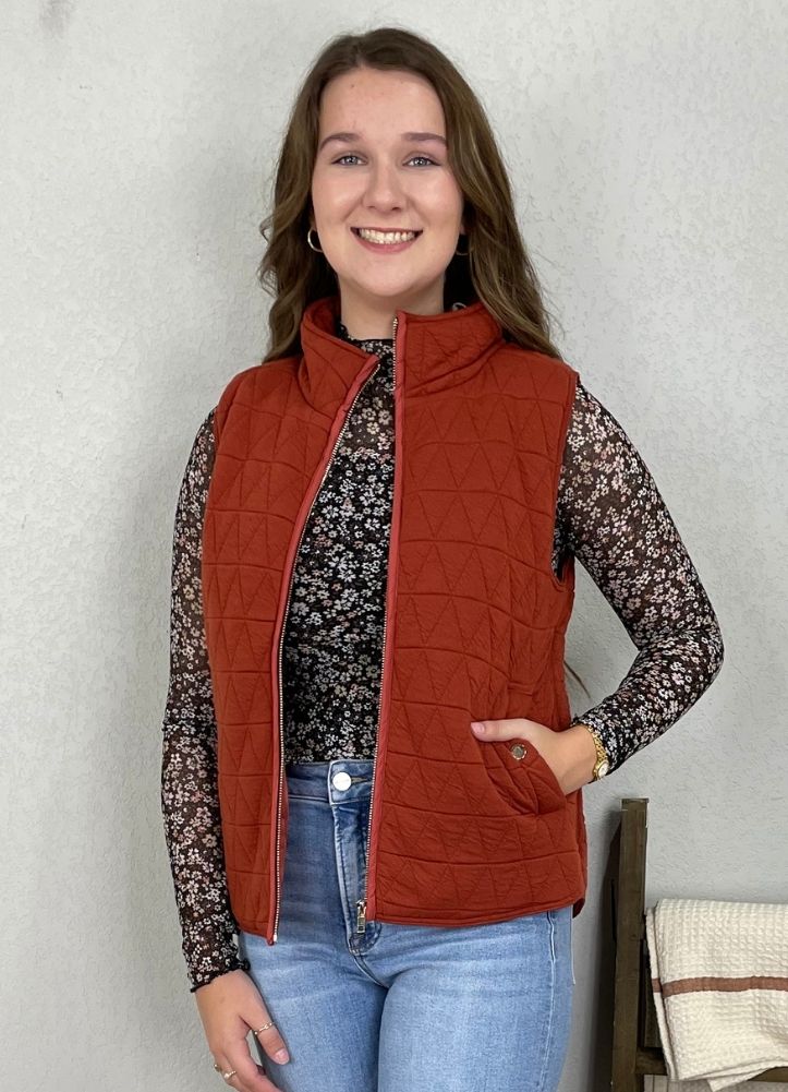 Layer up in style with this rust quilted vest, featuring a zip-front closure, high collar, and handy side pockets. Perfect for adding warmth and texture to your everyday outfits without the bulk.