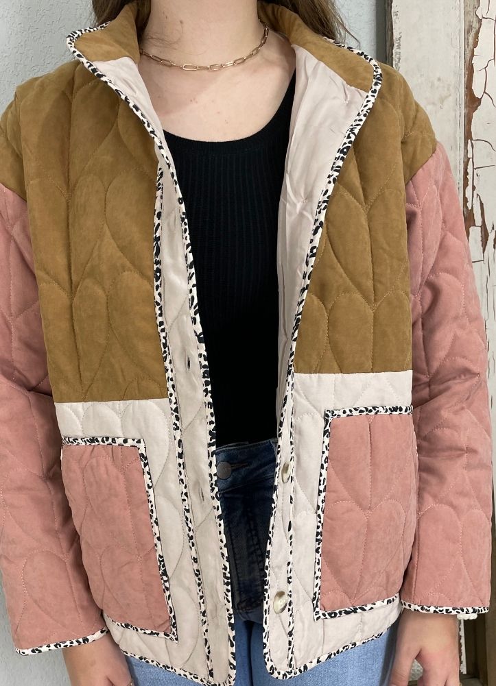 This color block quilted jacket features a camel top half, and a cream bottom half with blush sleeves and blush front pockets. It is lightweight and not bulky but thick enough to keep you warm.