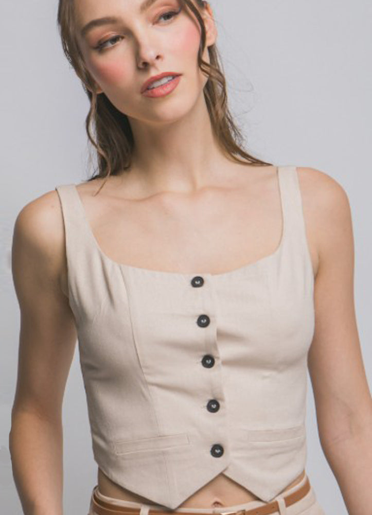 This chic beige cropped vest top features a square neckline, bold black button-down front, and tailored fit with a pointed hem—offering a neutral-toned, polished look that's perfect for smart-casual styling or layering with effortless sophistication.
