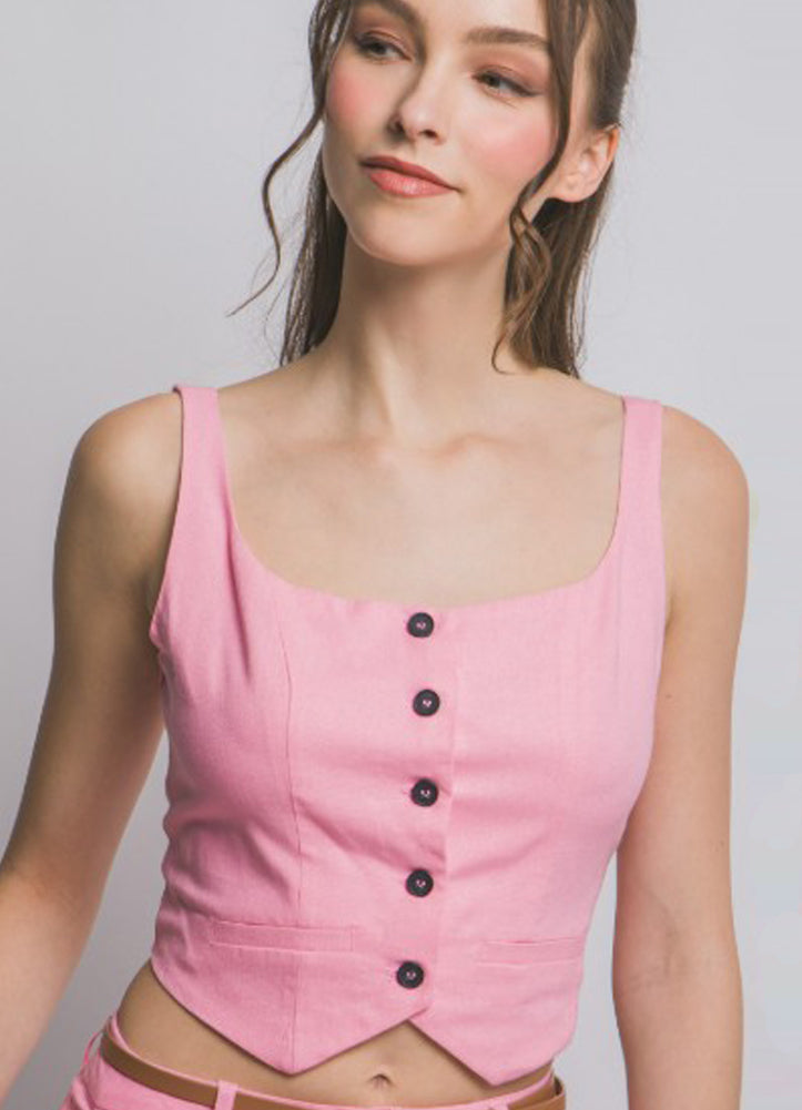 Add a pop of playful polish to your wardrobe with this candy-pink cropped vest top, featuring a structured square neckline, contrast black buttons, and a sleek pointed hem that flatters the waist—perfect for everything from brunch dates to summer soirées.