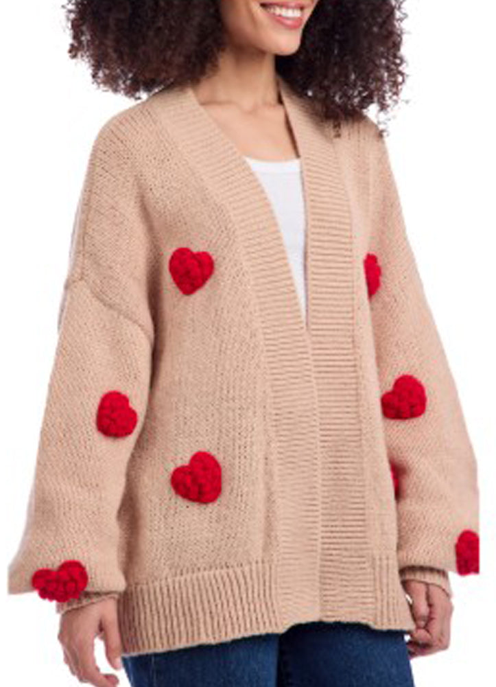 Fall in love with cozy layers in this charming heart-accented cardigan. Featuring playful red knit hearts on a soft blush background, this open-front sweater is perfect for adding warmth and a touch of whimsy to your everyday look. Pair it with jeans and a tee for sweet, casual style.