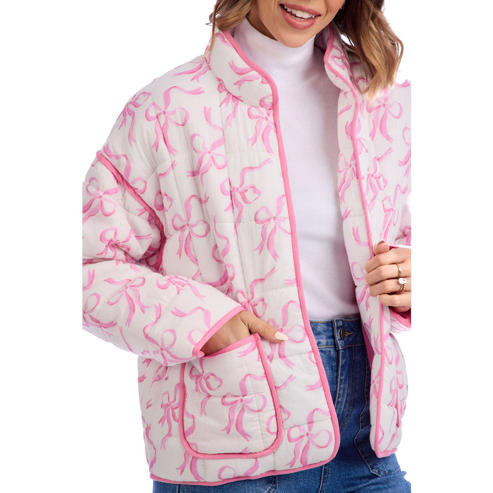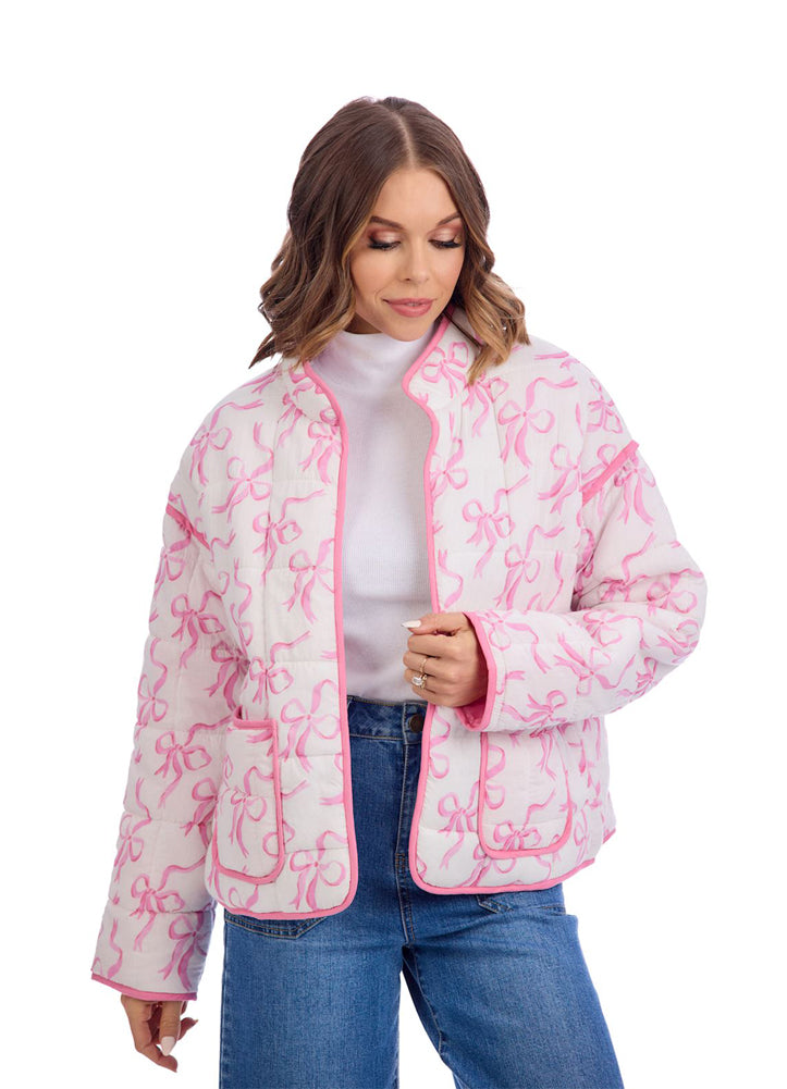 This adorable quilted jacket features a playful pink bow print, adding a fun and feminine touch to your fall or winter wardrobe. The soft fabric and cozy fit make it a perfect layering piece, while the bright design brings a cheerful vibe to any outfit.