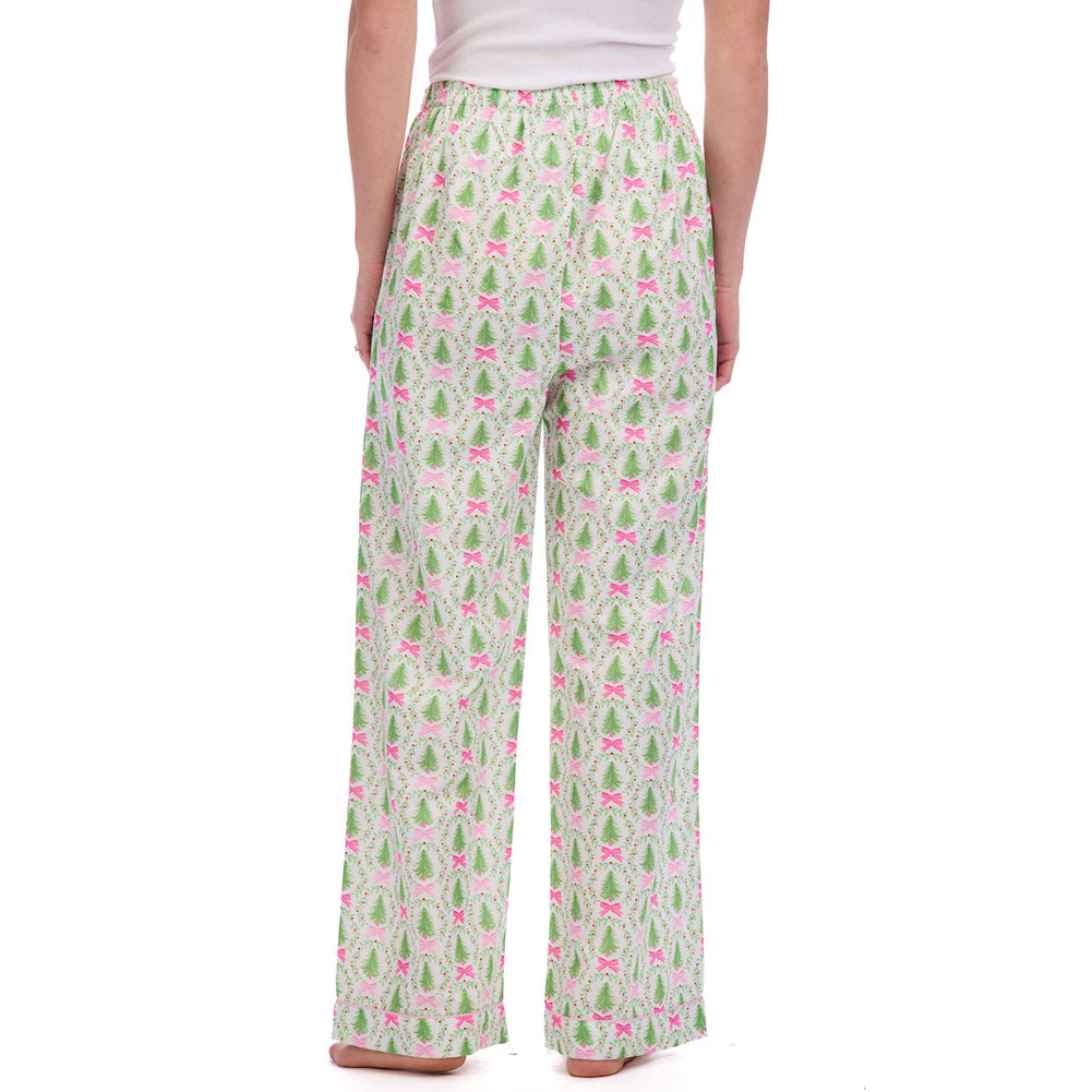 Get cozy in holiday cheer with these festive pajama pants. Featuring a playful Christmas tree and bow print with a soft pink tie waist, they're the perfect pair for sipping cocoa and unwrapping gifts in comfort and style.