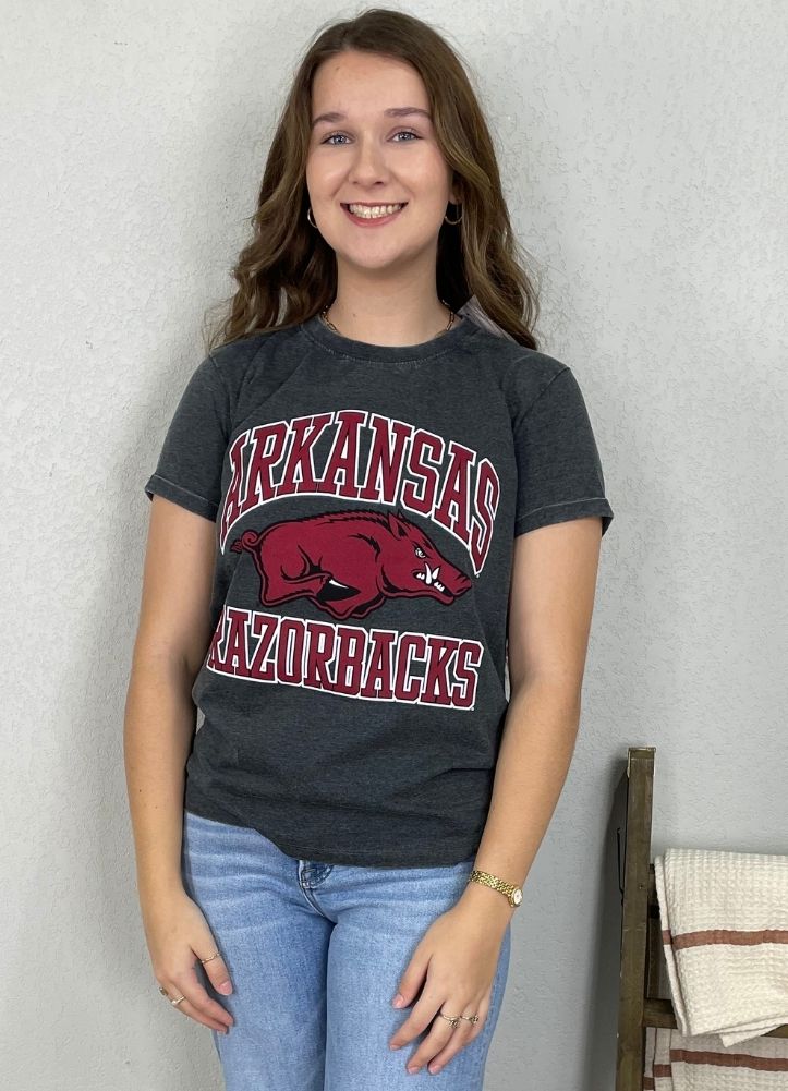 Pressbox brings us this so soft vintage boyfriend tee in black, which reads as a heather dark grey. Featuring a crew neck and folded short sleeve cuff, this us sure to be a staple in the wardrobe of any Razorback fan.