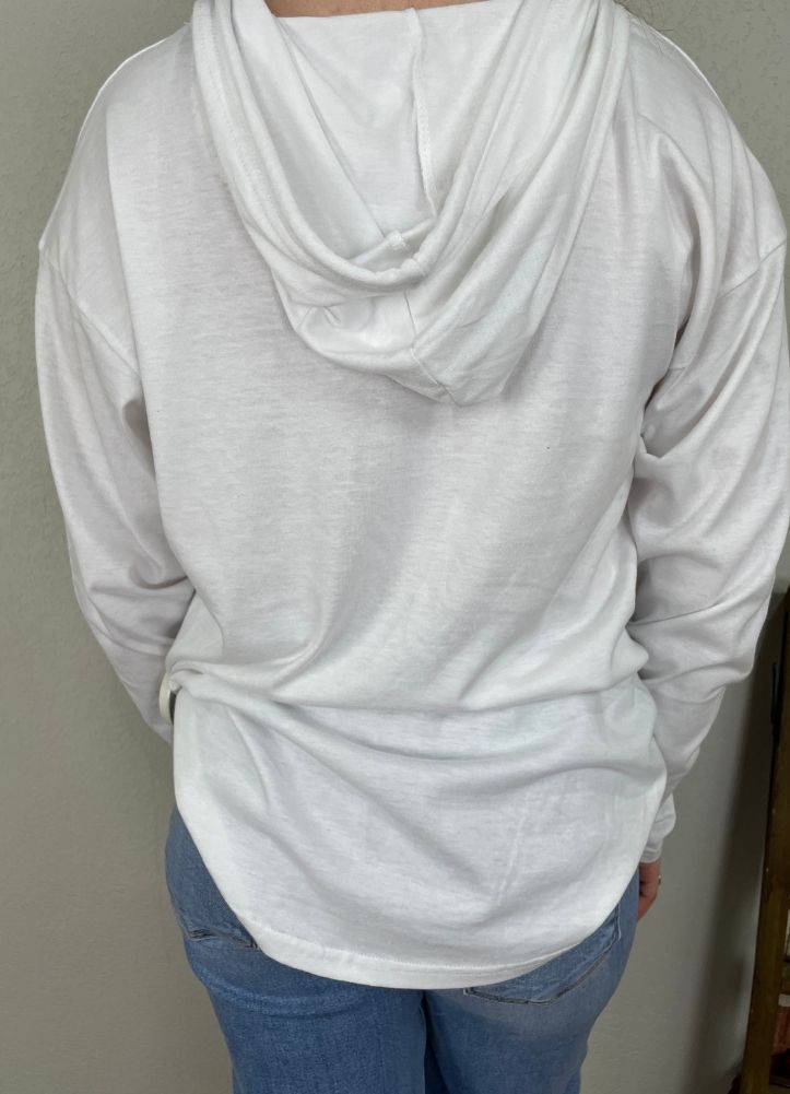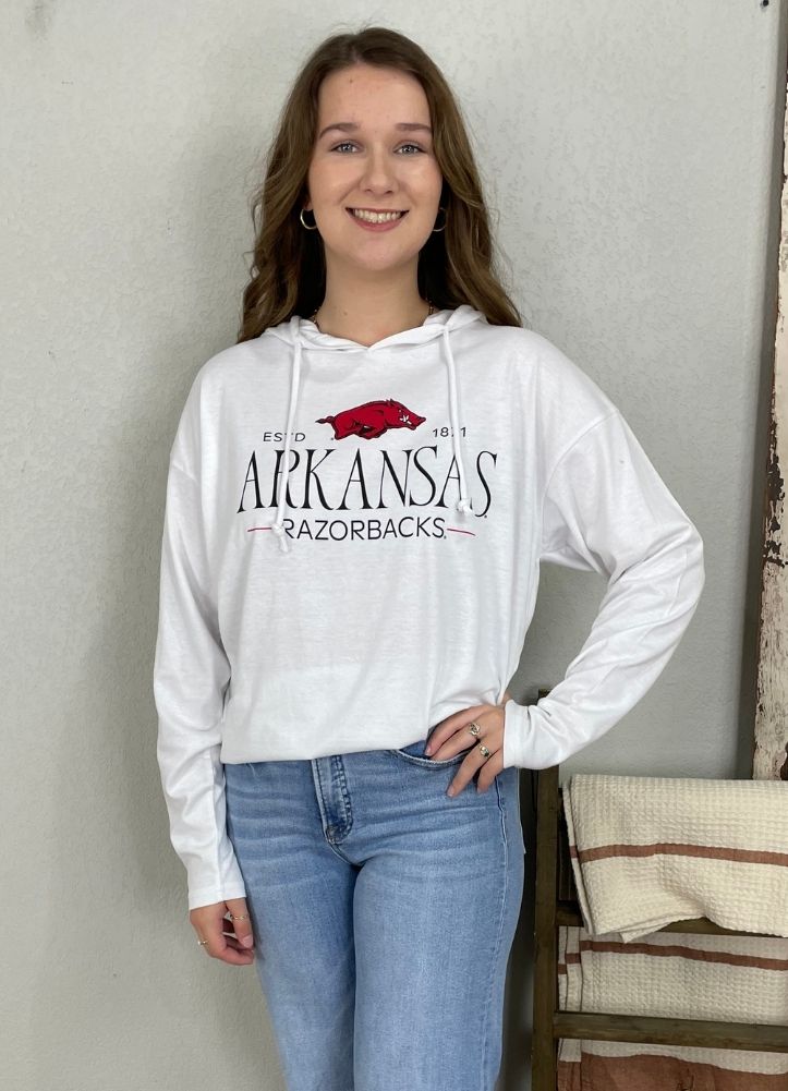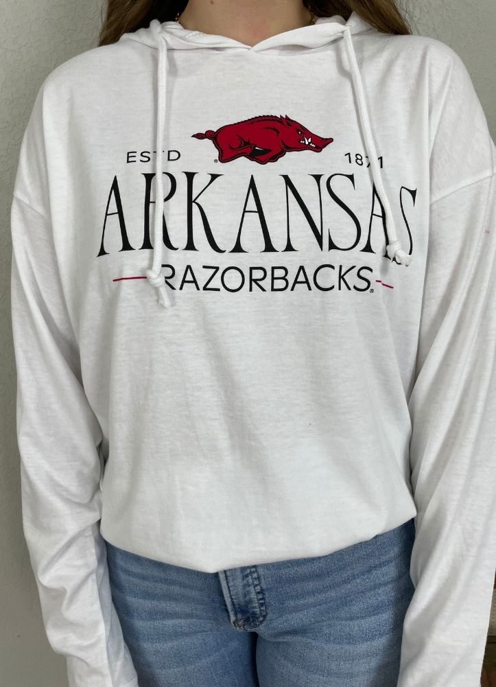 If you love a lightweight hoodie tee and the Razorbacks, this is the perfect combination for you! This white lightweight long sleeve tee shirt features a hood with functional drawstrings, and a rounded bottom hem.