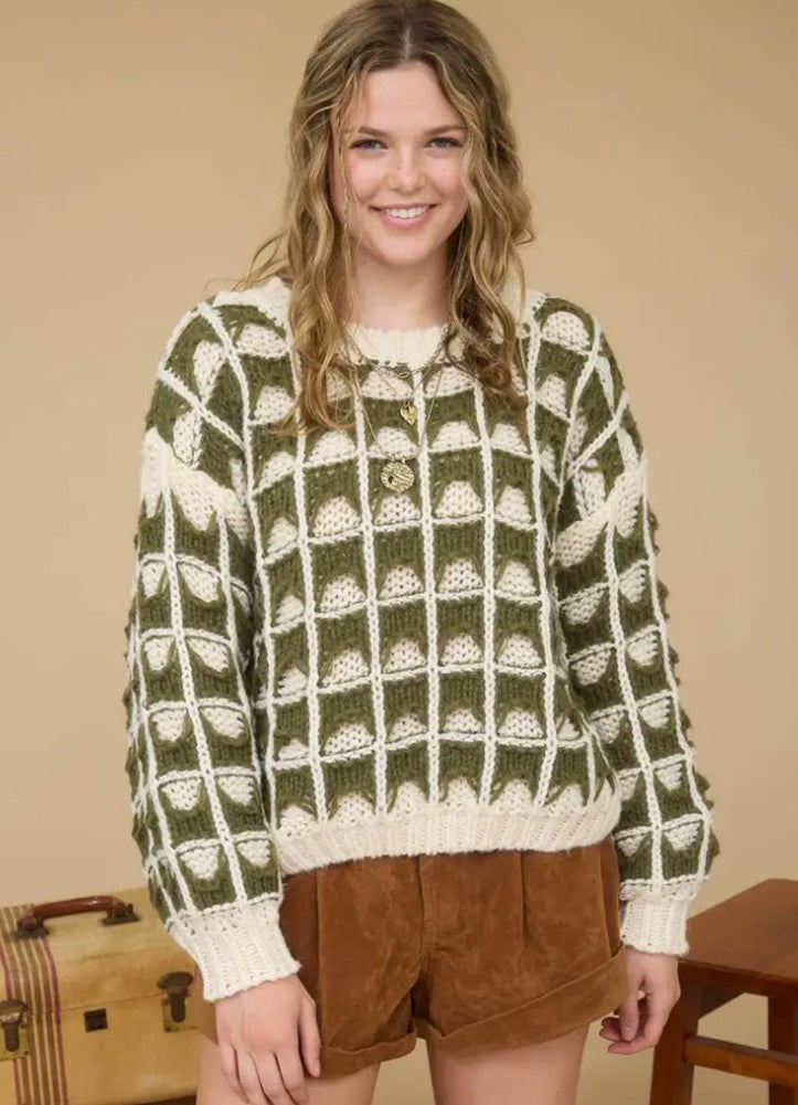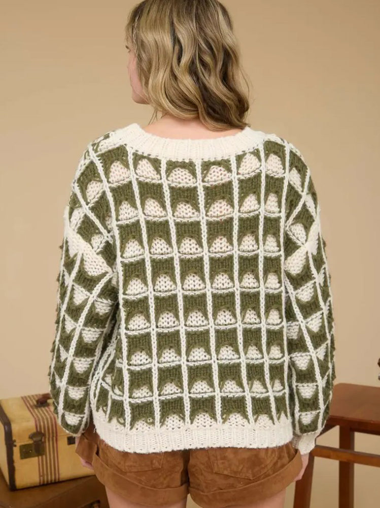 Cozy up in this chunky knit sweater featuring a unique olive and ivory geometric pattern, long sleeves, and a relaxed fit for effortless style.