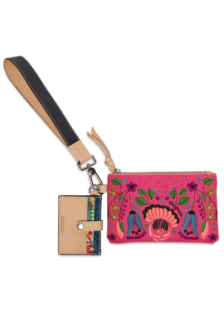 Brighten your day with this vibrant Consuela wristlet featuring bold floral embroidery, a detachable wrist strap, and a matching cardholder. Perfectly sized for essentials, it's lined with a cheerful yellow interior and crafted for both style and convenience.