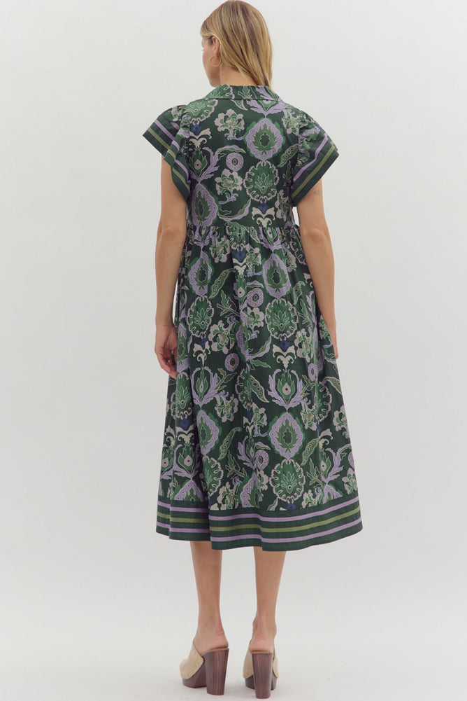 Multi Print Midi Dress with Flutter Sleeves in Green by Entro