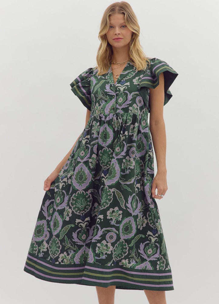Make a bold yet effortless statement in this flowy midi dress, featuring a rich green and lilac floral paisley print, flutter sleeves, and a flattering gathered waist. Perfect for brunch dates, garden parties, or just turning heads wherever you go.