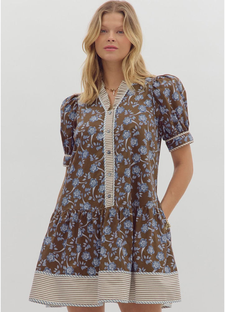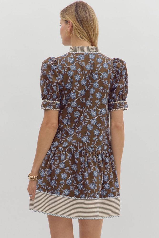 Sweet and sophisticated, this floral mini dress features a charming mix of blue blooms on a rich brown backdrop, accented with crisp striped trim at the cuffs, collar, and hem. Puff sleeves and a tiered skirt bring a playful vintage vibe, while side pockets add everyday ease. Perfect for dressing up or down with effortless style.