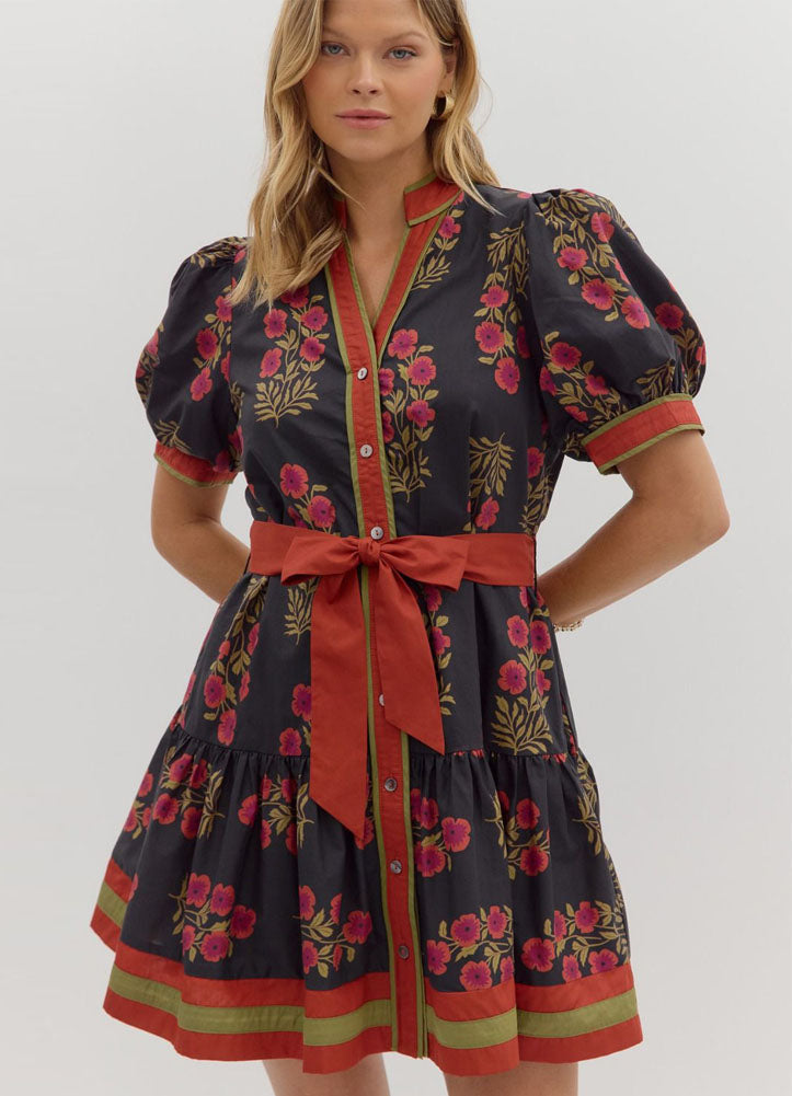 This chic mini dress features a black base with bold floral prints, puff sleeves, contrast trim, and a red waist tie, combining elegance, comfort, and playful feminine charm.