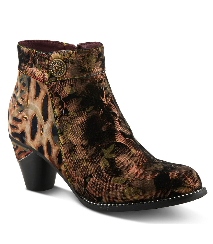 Make a bold style statement with the Dessalynn Bronze Floral Ankle Boot. There vintage inspired design meets modern flair. Featuring a stunning floral and abstract tapestry print in rich bronze, gold, and earthy tones, this boot adds an instant pop of personality to any outfit. The textured fabric finish, decorative button detail, and contrasting heel pattern create a look that's both artistic and elegant.
