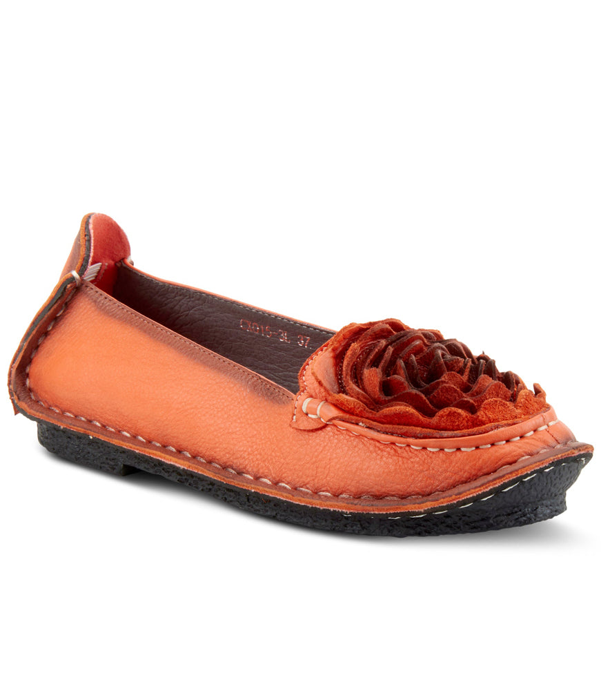 L'Artiste has brought us this new Dezi style shoe in the color orange. This shoe is made from a high quality leather and features a flower on the toe of the shoe. L'Artiste is part of the Spring Step family brand of shoes.