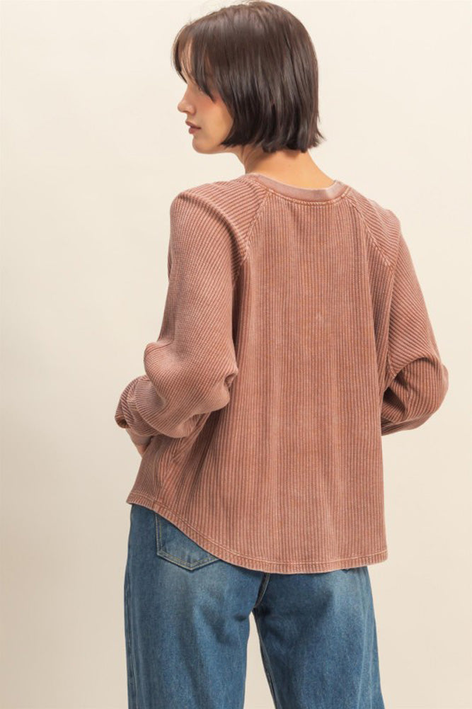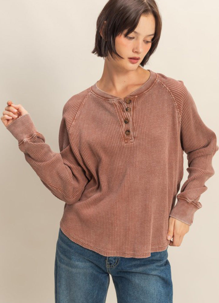 Mineral Wash Henley Waffle Knit Top with Raglan Sleeves in Chestnut by Hyfve