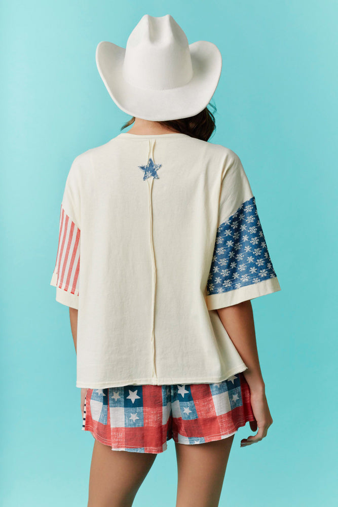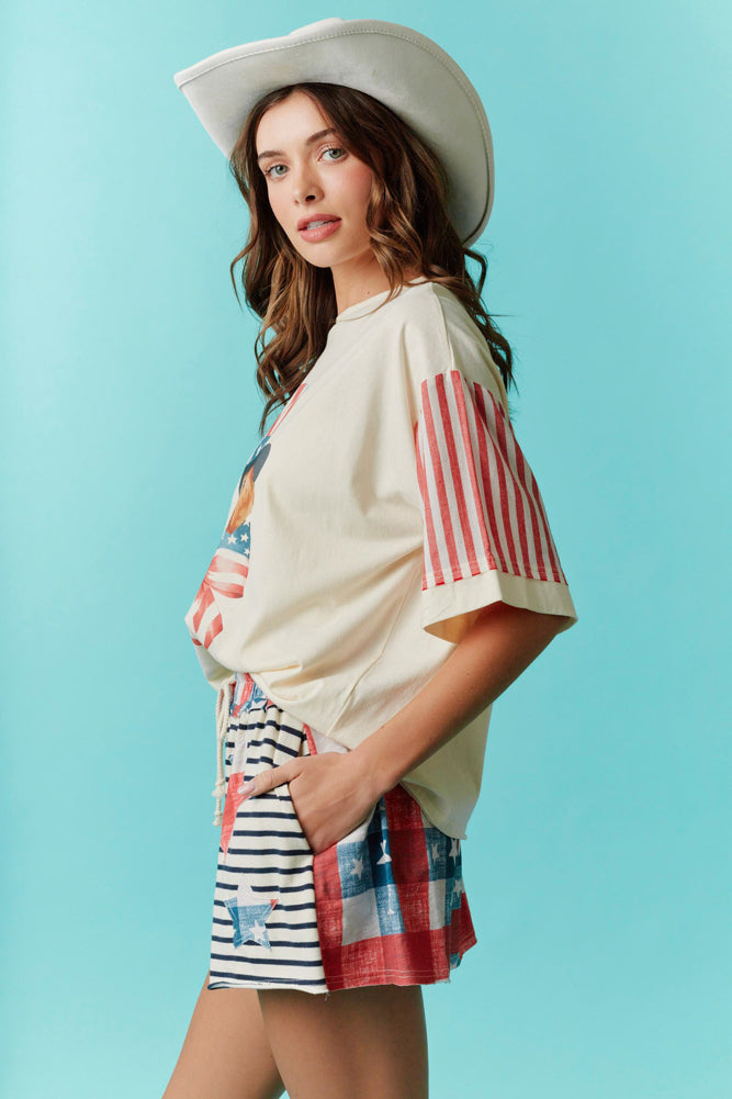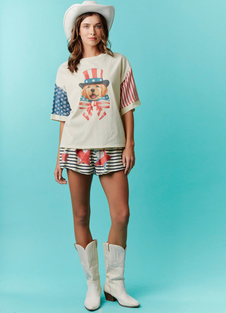 Americana Puppy Graphic Tee with Contrast Sleeves in Ivory by Fantastic Fawn