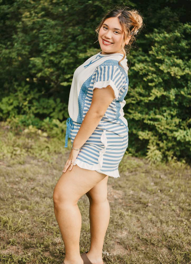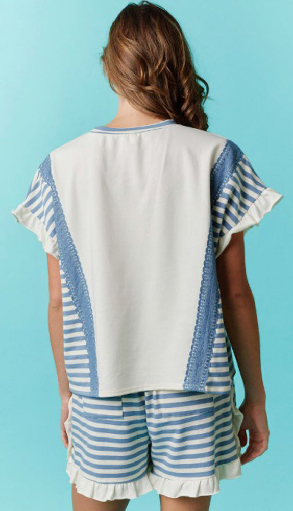 This breezy short-sleeve top blends soft cream tones with nautical blue accents, featuring striped ruffle sleeves, textured lace panels, and a playful stitched 'X' neckline — a charming match for laid-back summer days.