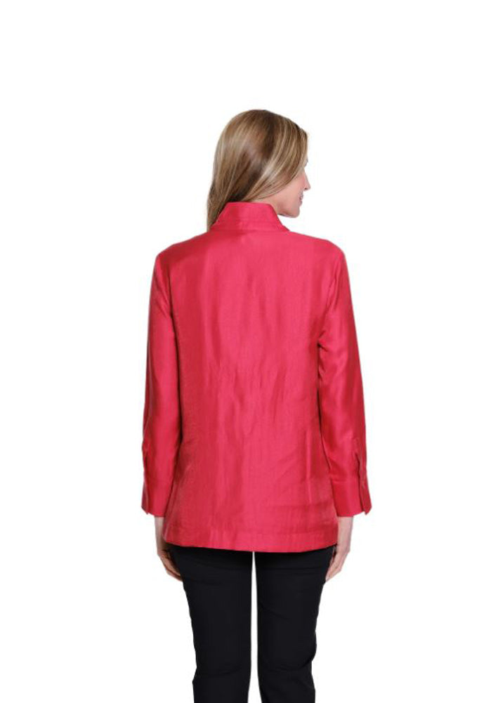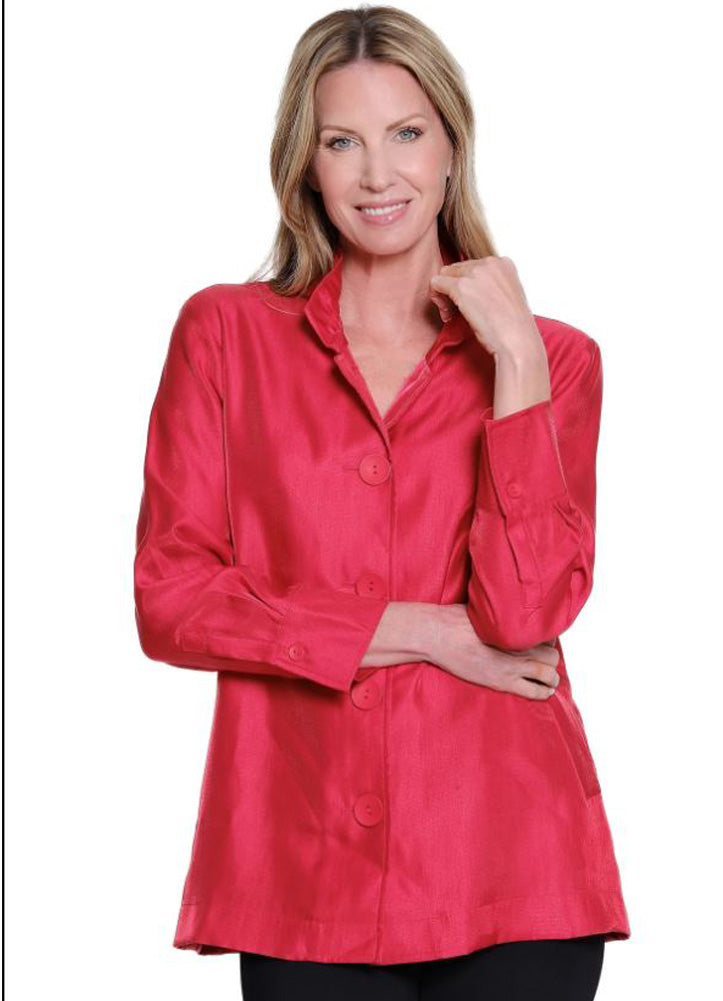 Make a statement with this beautifully tailored button-front jacket, designed in a rich red hue that instantly elevates any outfit. Featuring a smooth, lightweight fabric, classic collar, and clean lines, it layers effortlessly over tops or dresses for a polished look from day to evening.