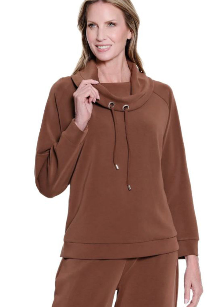 Cuffed LS Raglan Drawstring Cowl Collar Top in Rich Chocolate by S.Y.I